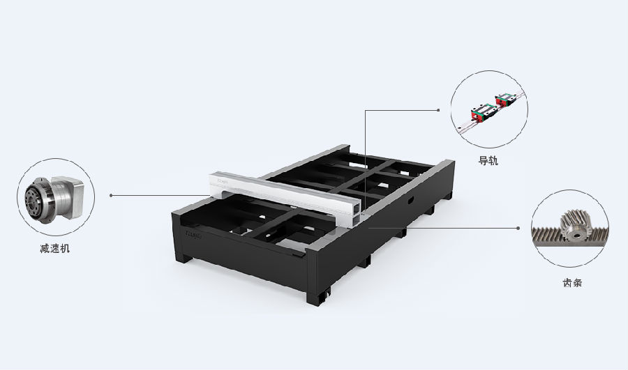 光纖激光切割機配備臺灣yyc齒條,日本新寶法蘭輸出減速機、臺灣上銀導軌。